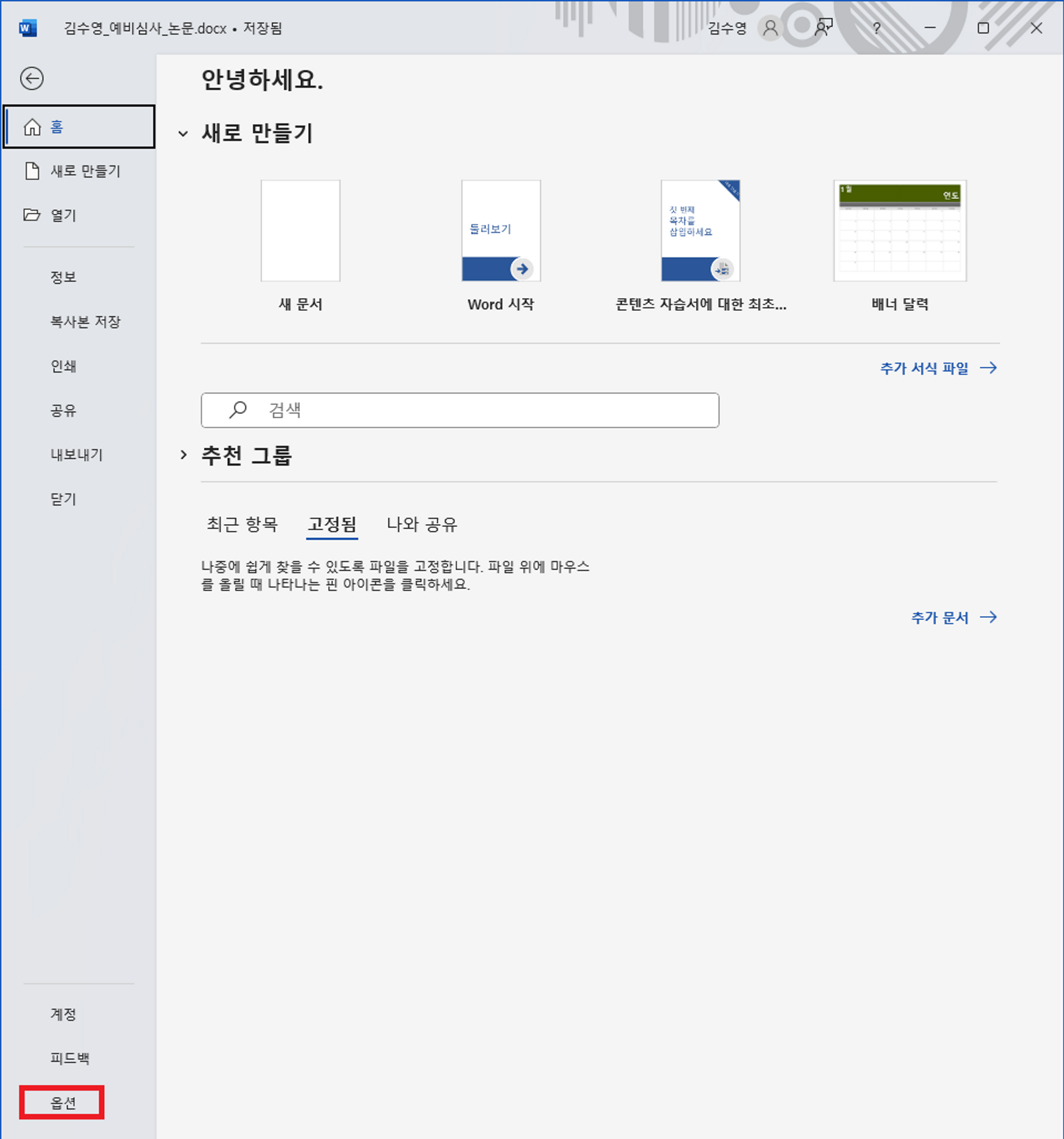 파일 > 옵션을 눌러서 Word 옵션을 활성화한다