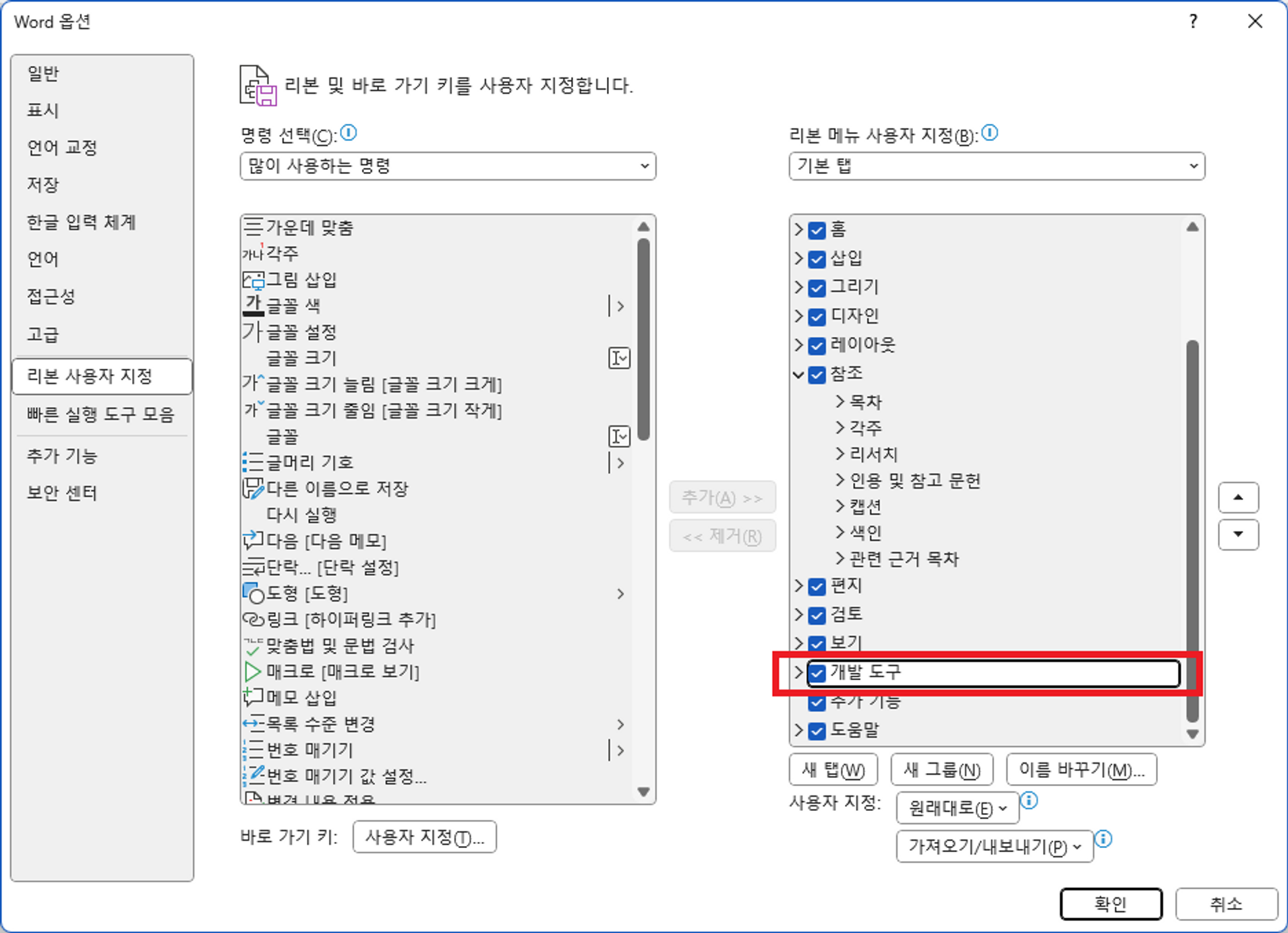 리본 사용자 지정 > 오른쪽 메뉴에서 개발도구를 활성화한다