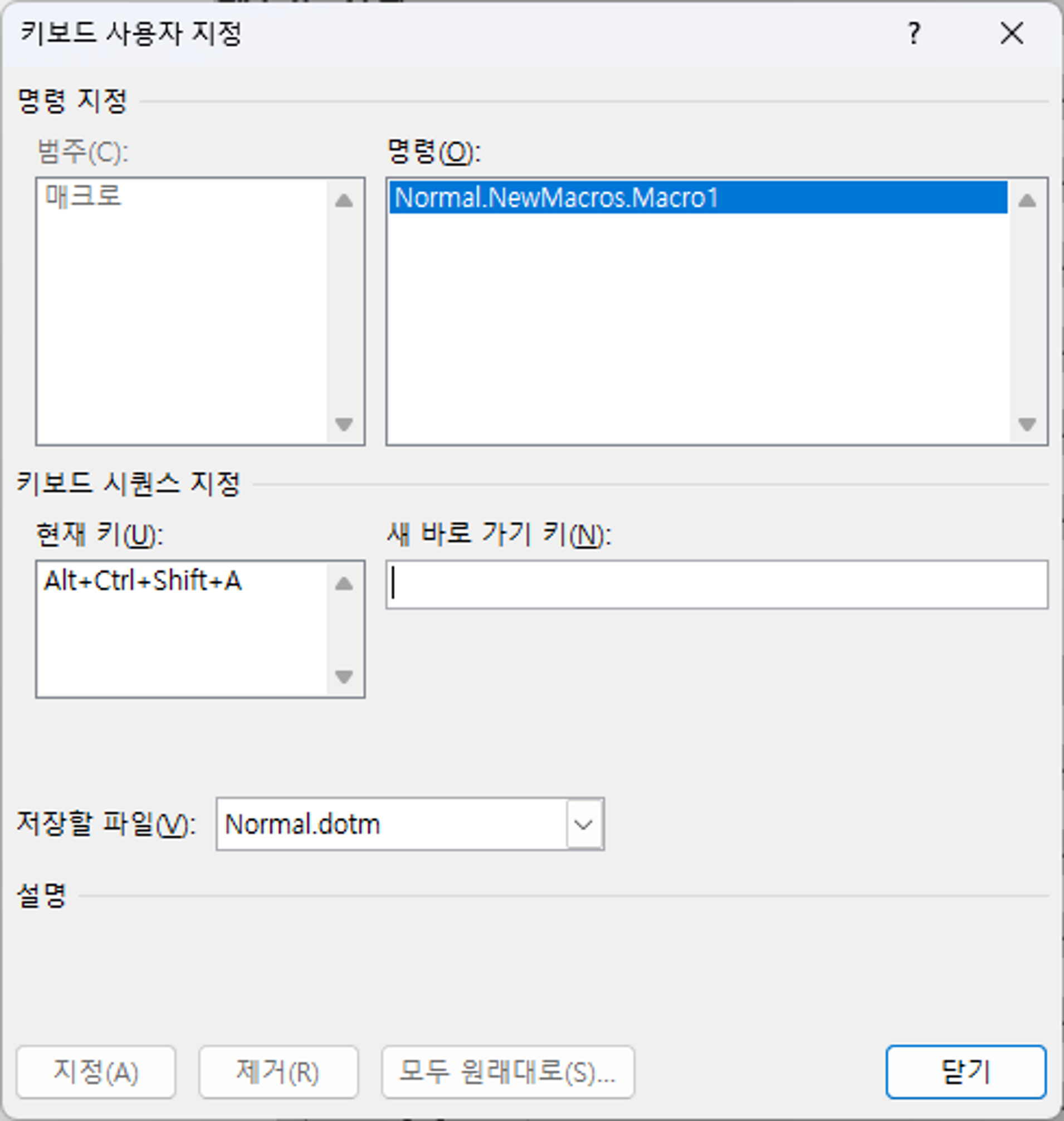 원하는 키를 “새 바로 가기 키”로 입력한 후, 지정 버튼을 클릭한다